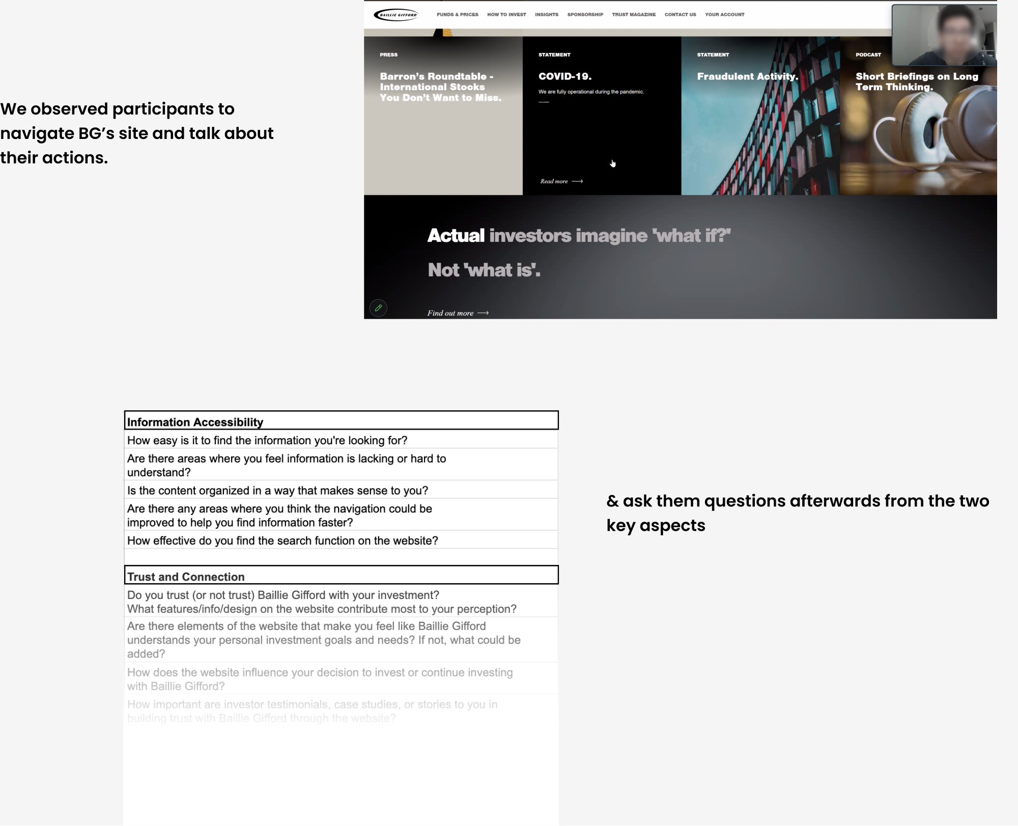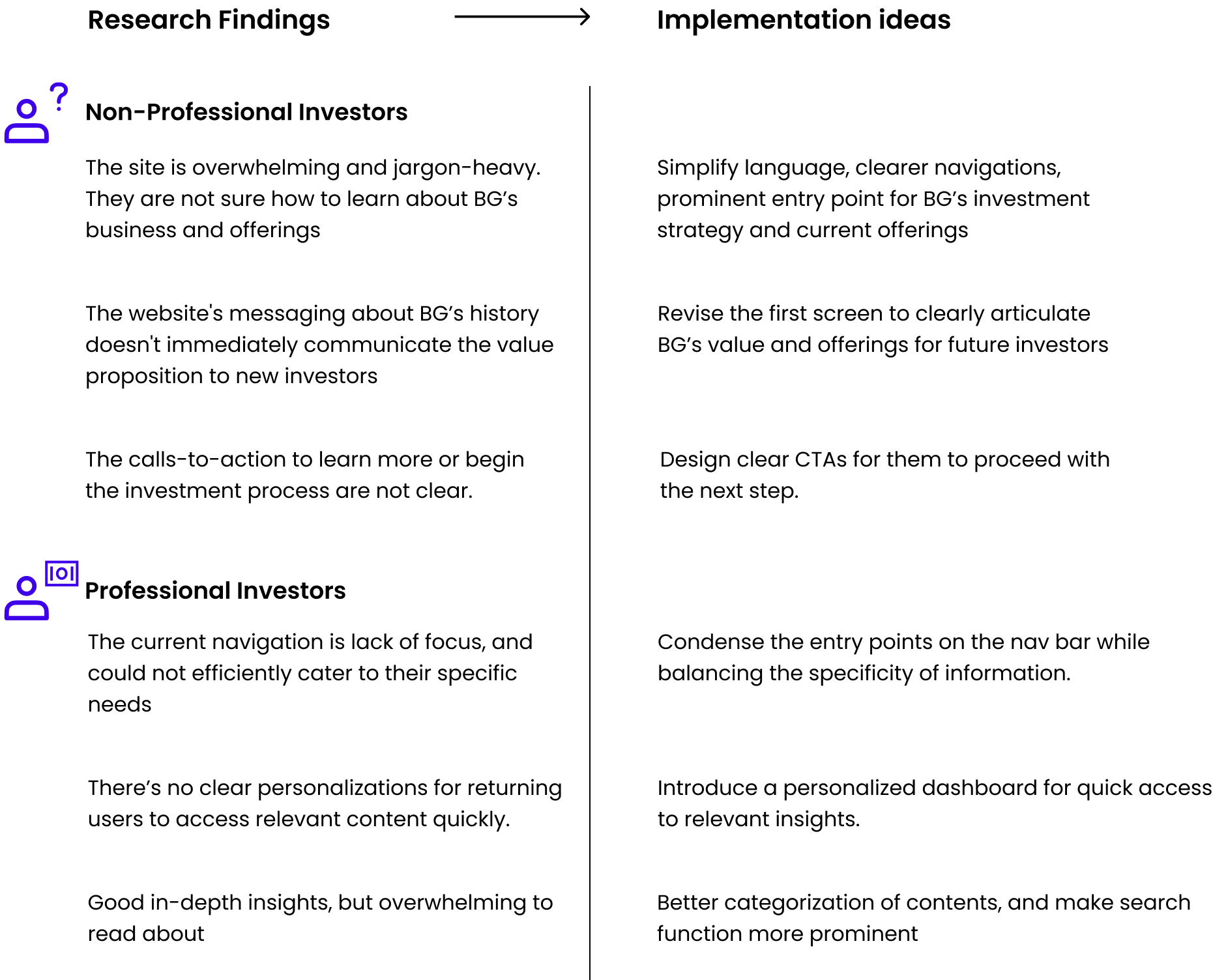 We still did research although a specific content strategy was defined. Although the design team recommend personalized contents for different investor types, it’s out of the current scope. The project would better off by integrating research better.