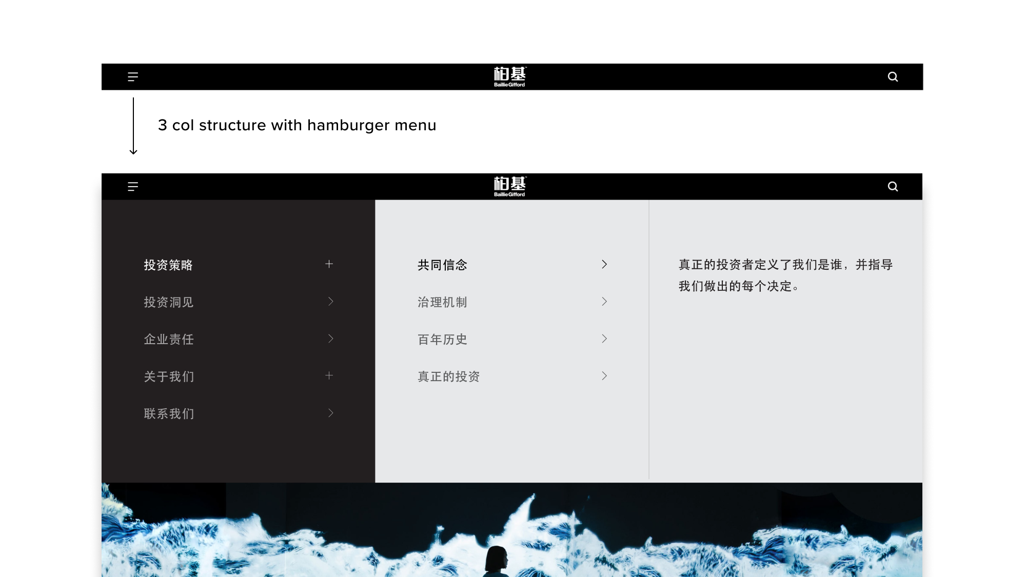 Chinese characters are more visually complex and bulky. It looks visually crowded if maintaining the same layout. Therefore, we adopted a hamburger menu to enclose all the tabs, while keeping the visual consistency.