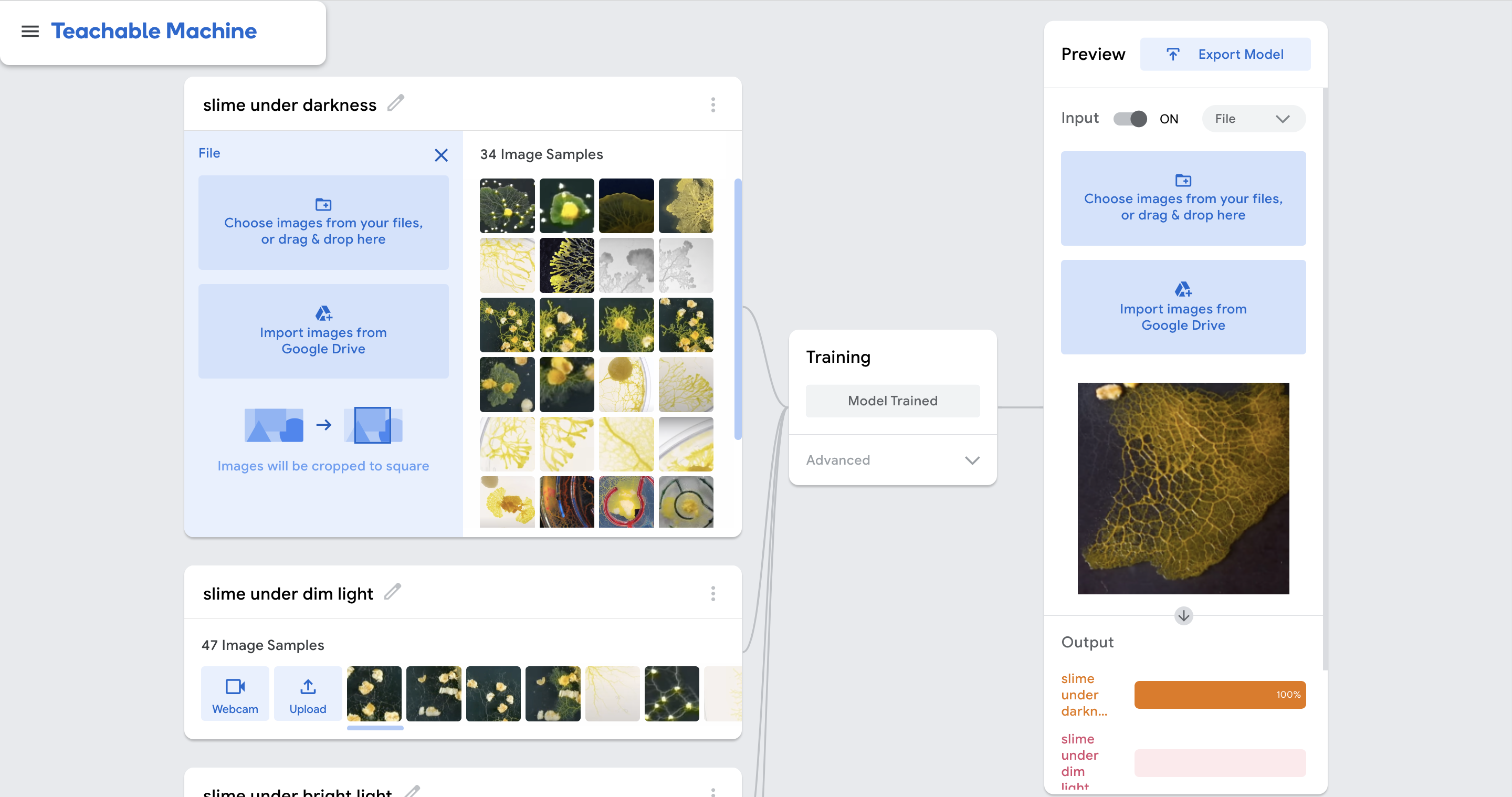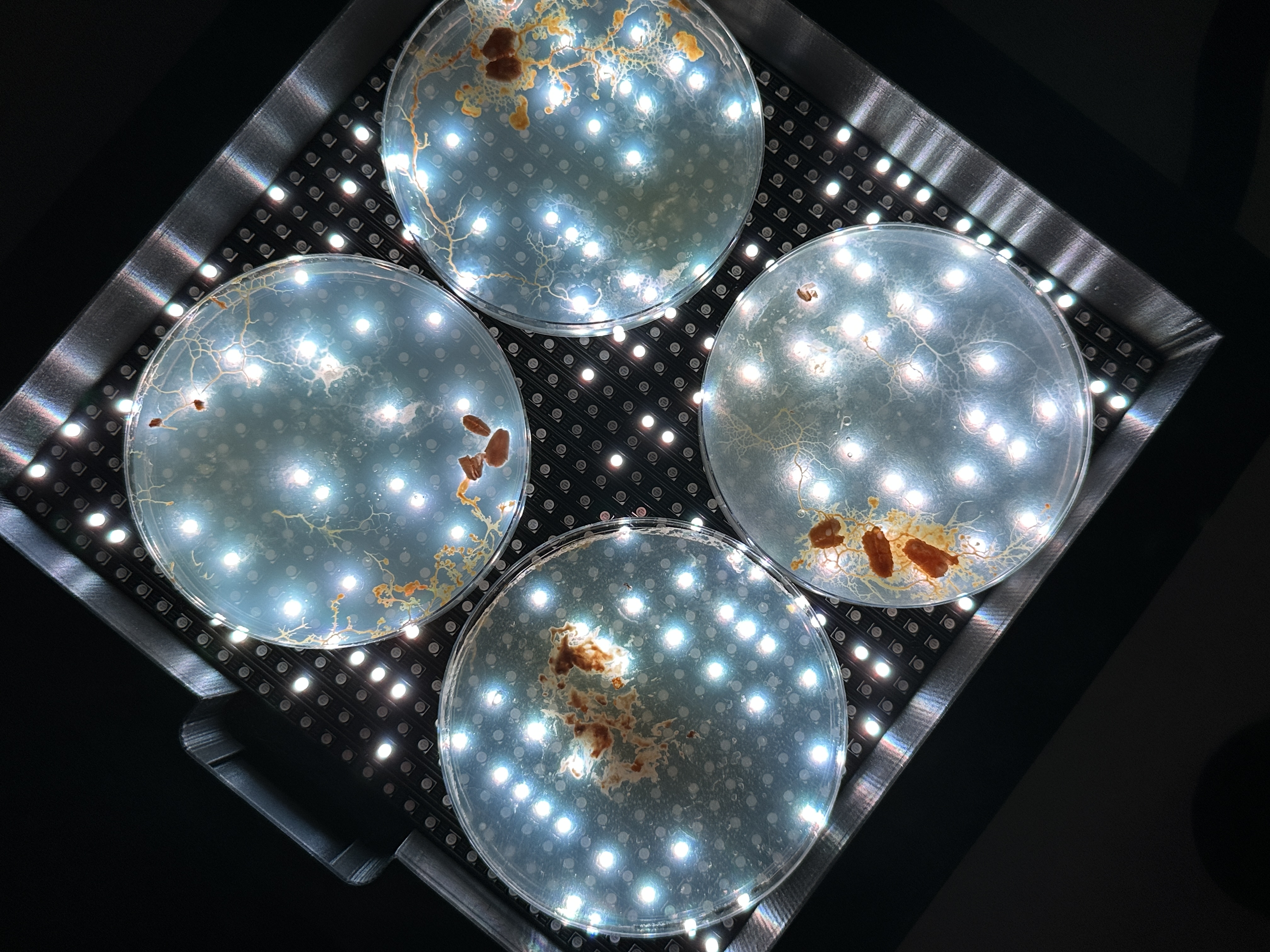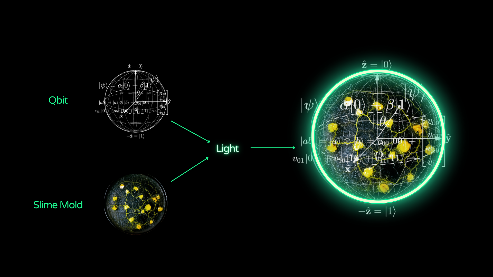 This project is an artwork that used the Quantum entanglement as a metaphor. We are looked at slime mold as a living quantum computer, and explored its entanglement with different lighting conditions during growth.