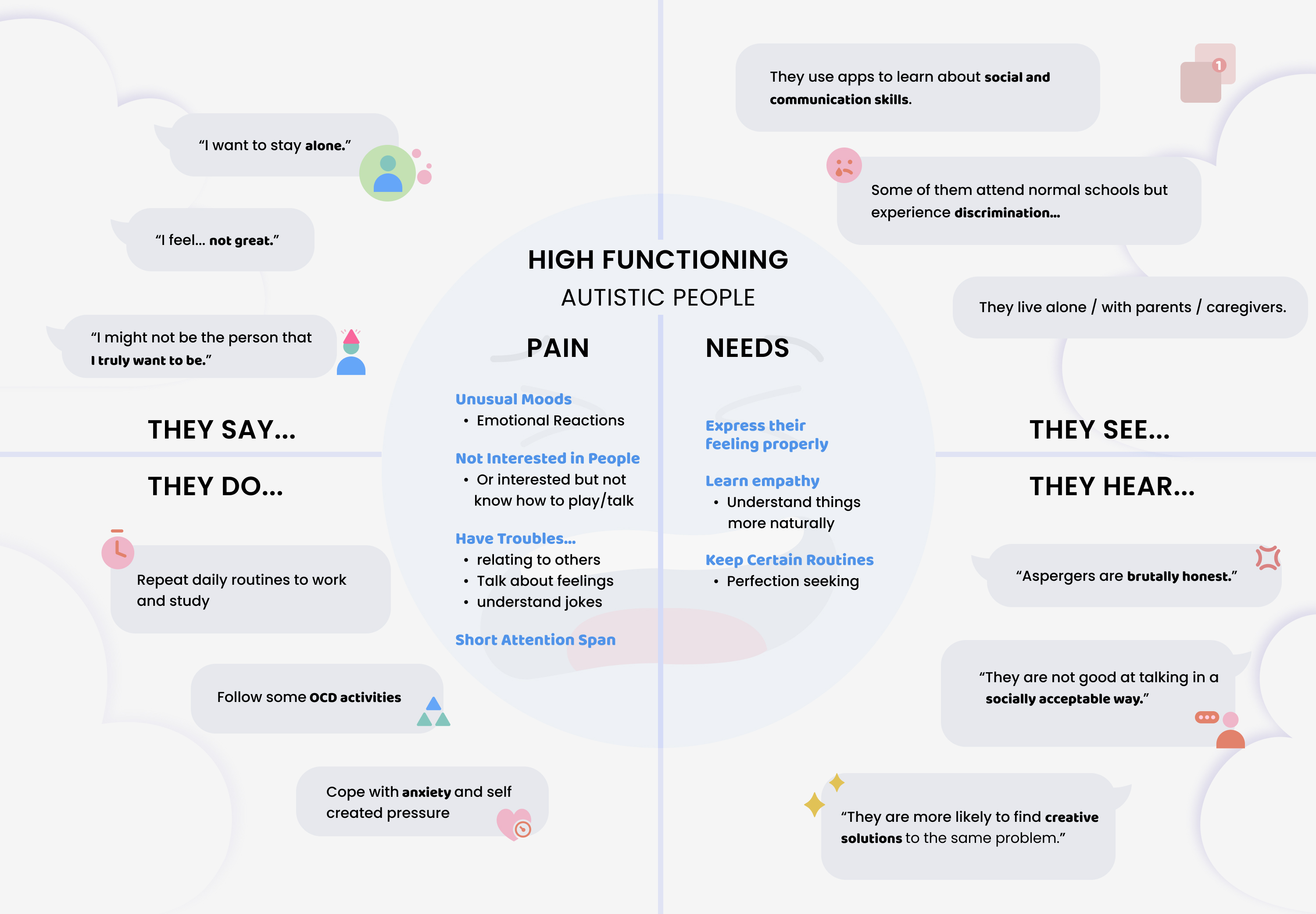 I did an empathy map to reflect wants and needs for High functioning autistic kids. I found many of them have pattern seeking behavior, and finding patterns makes them feel safe 2 .