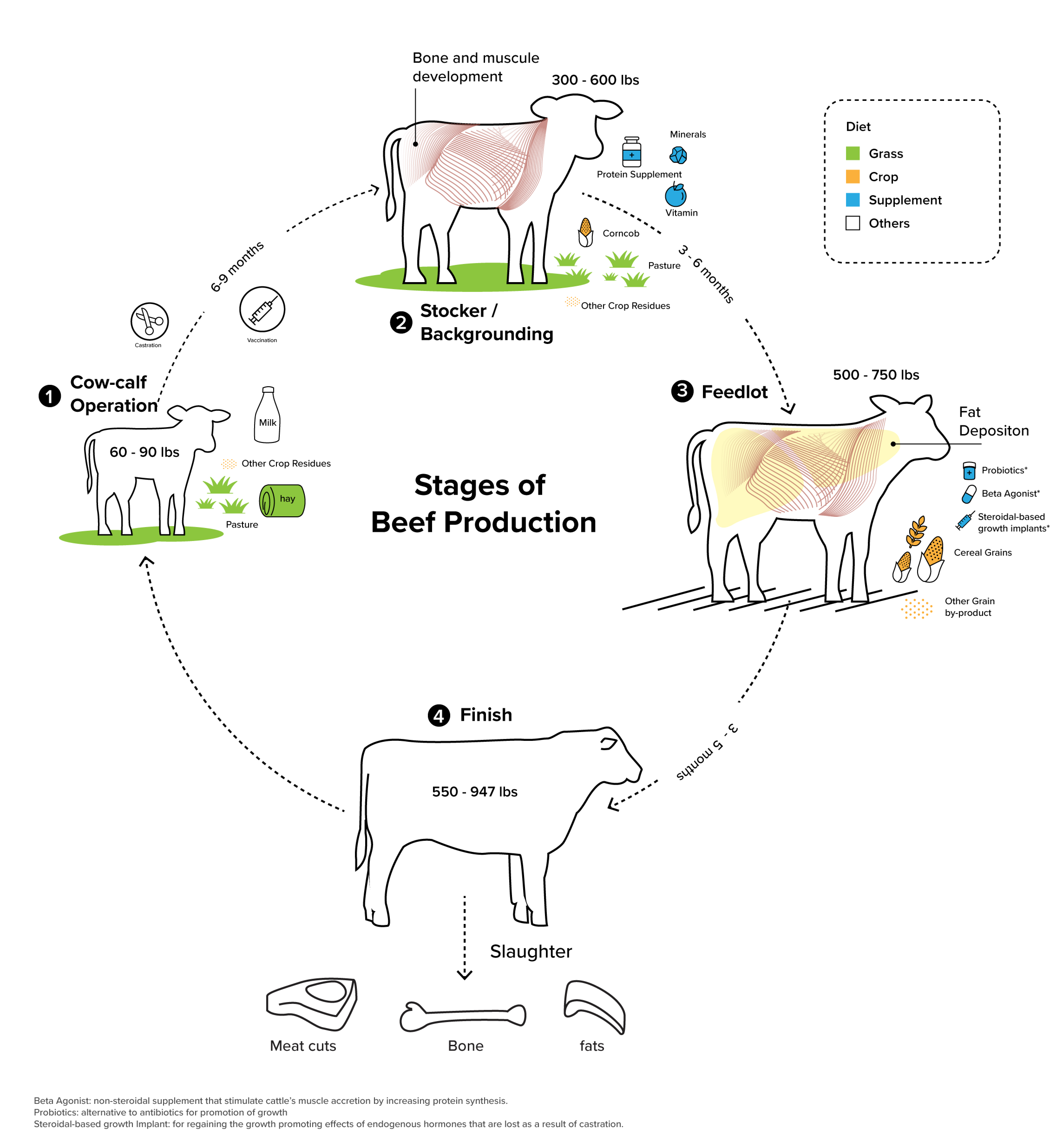 I illustrate the evolving living conditions and diets of cattle at various life stages. Through color-coding, I highlight the escalating levels of human intervention, tracing the cattle's journey from a living creature to a consumer product.