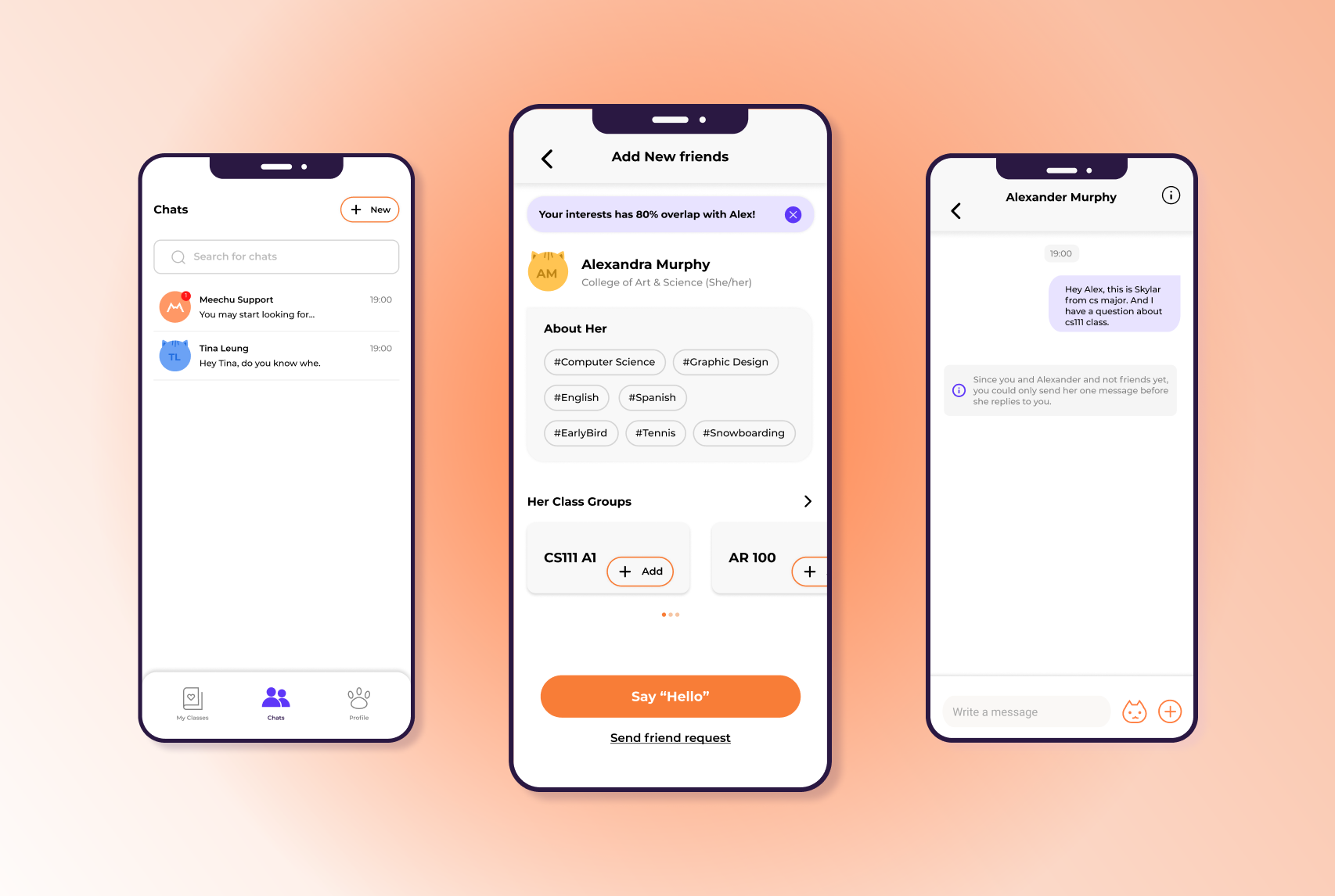 Meechu not only connectss you with classmates. You can also see how much of your interests overlap with other BU students, and form lasting relationships with them.