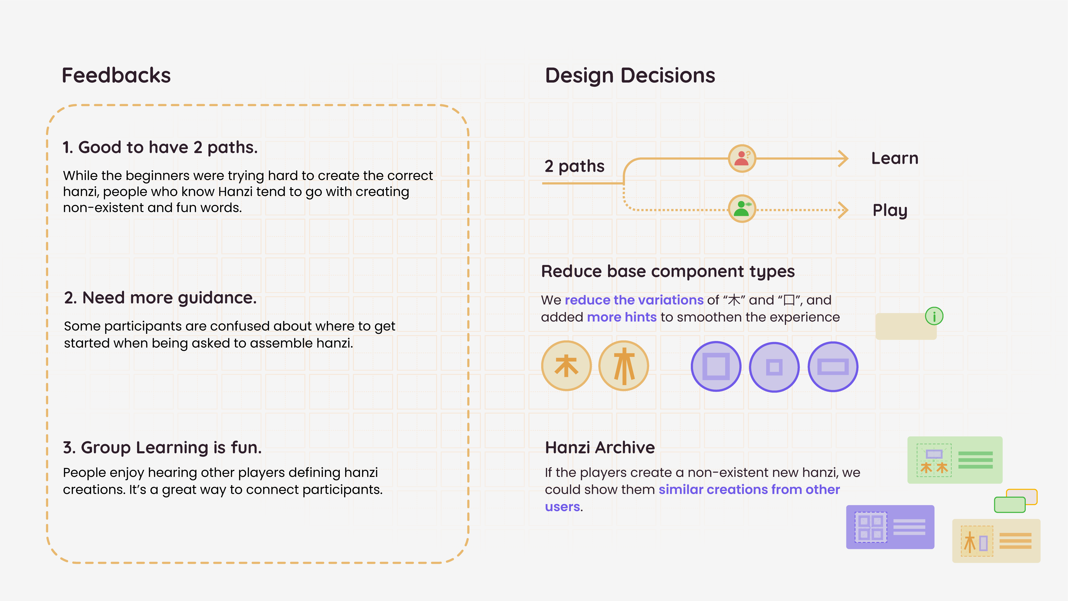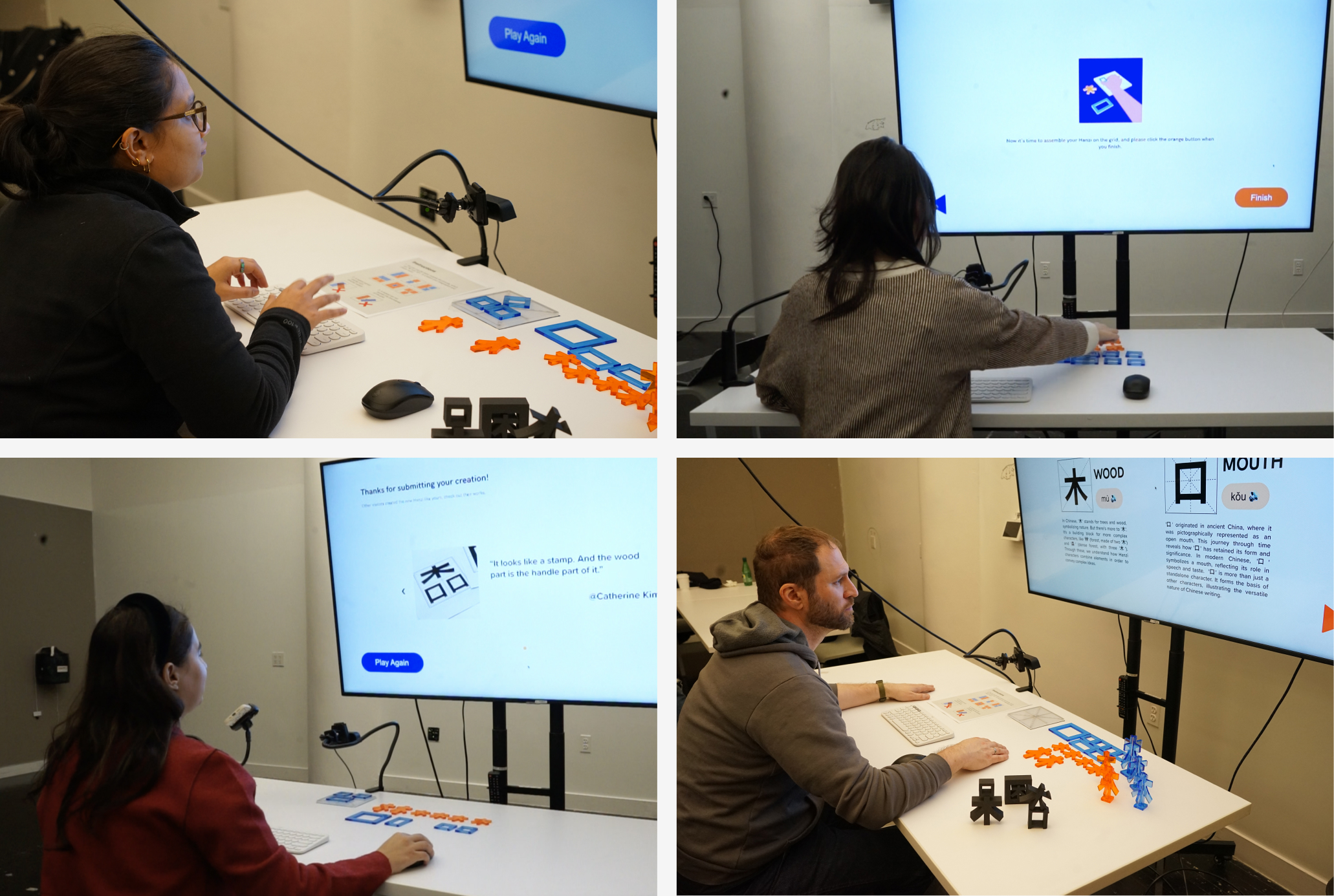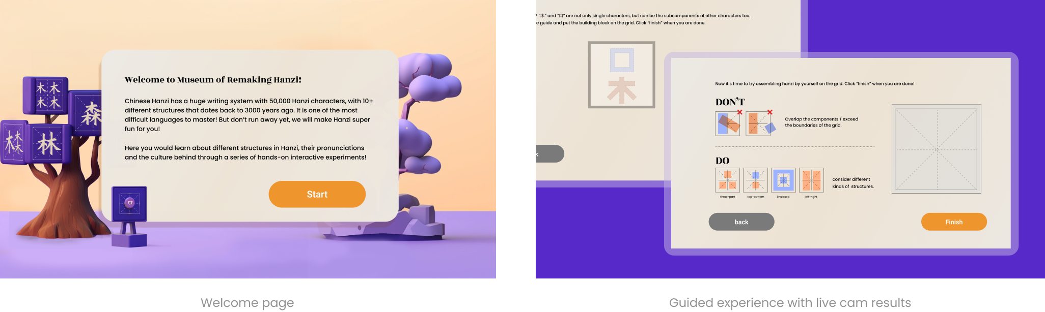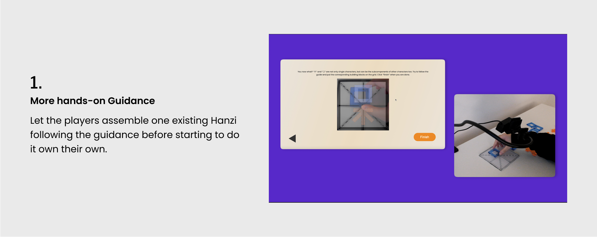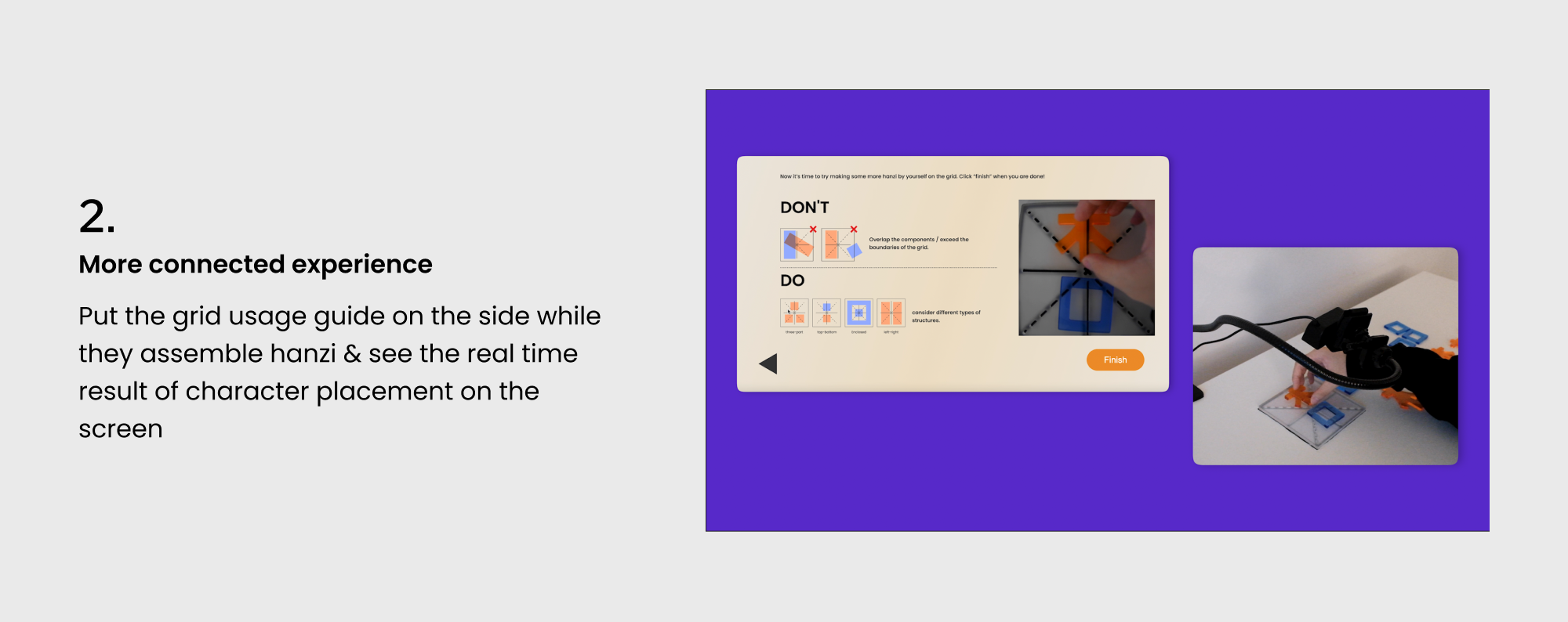 The beginner participants still feel confused when being prompted to assemble the hanzi building blocks. They also feel the digital experience is a bit disconnected from the physical one. So I made the following iterations: