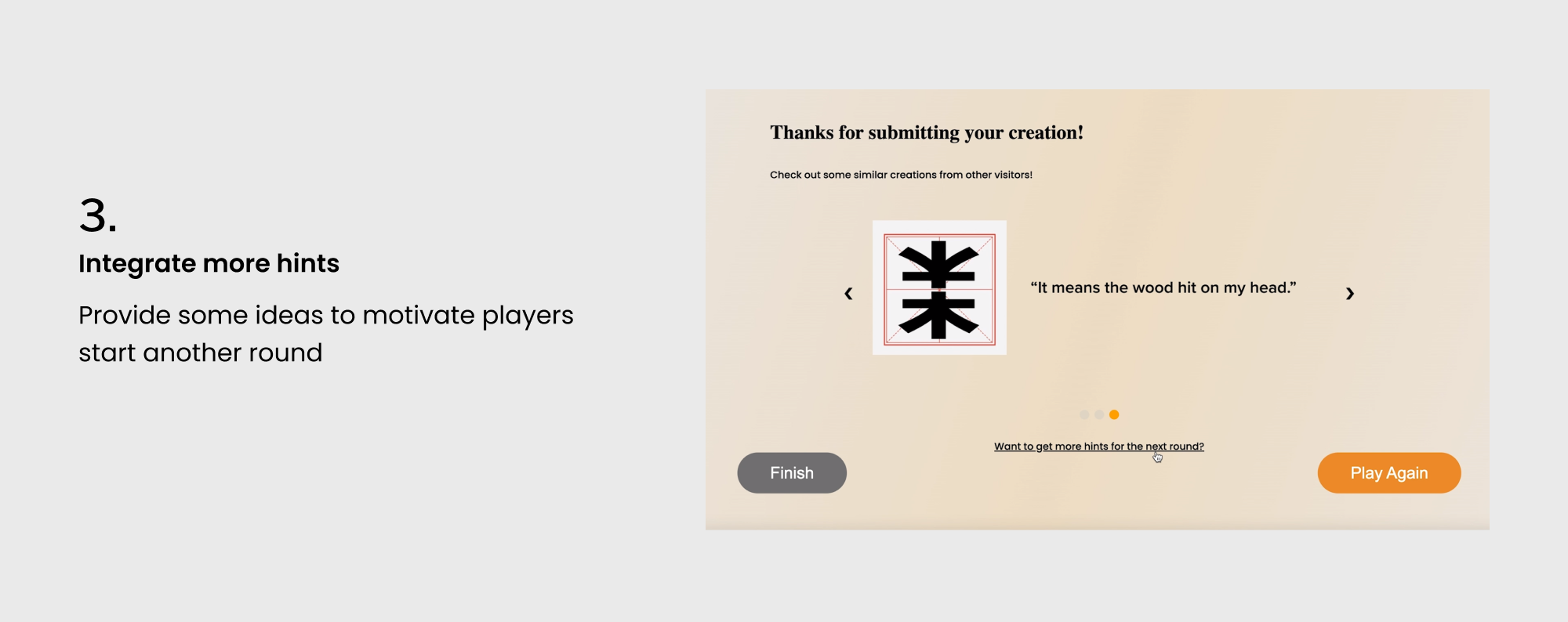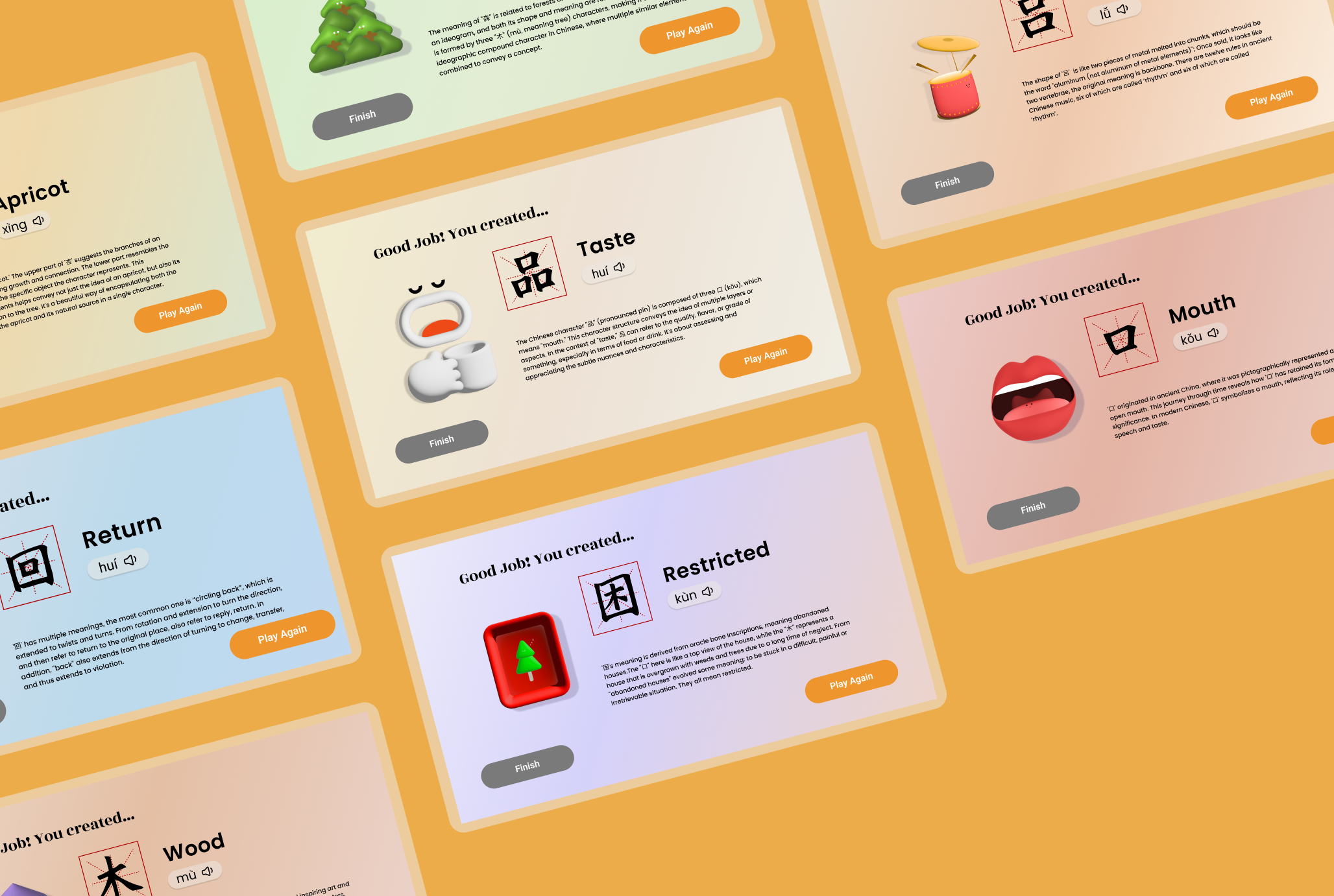 3. Players are then invited to create Hanzi by themselves. If they just created an existing hanzi, we show them the meaning of their creations based on Hanzi dictionary.