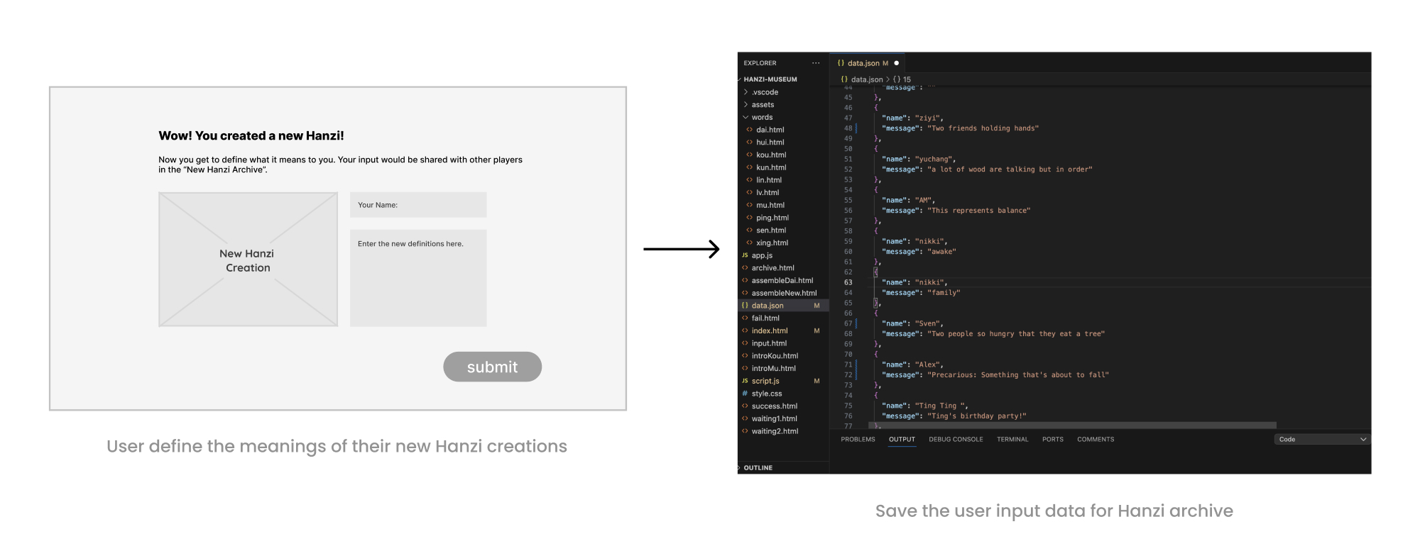 I also set up the backend server to read the users’ data input with Express, and save them to a json file for collecting “New Hanzi Archive”.